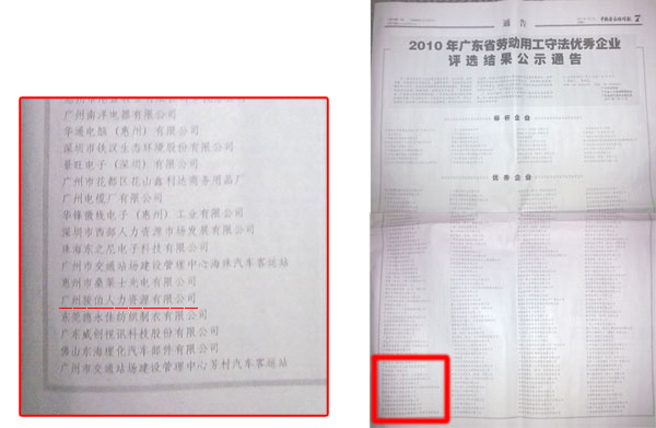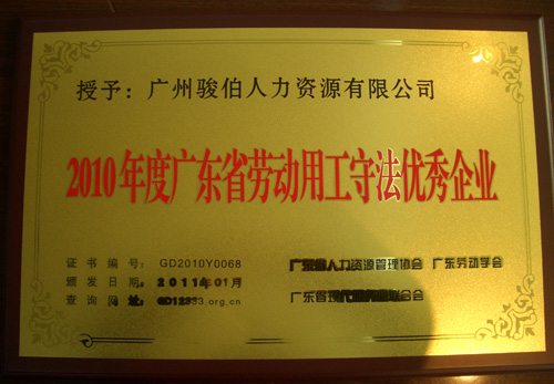 會議通過了《關于表彰2010年廣東省勞動用工守法優秀企業的決定》,授予中國聯通、工商銀行、駿伯人力等兩百多家企業為2010年廣東省勞動用工守法優秀企業。