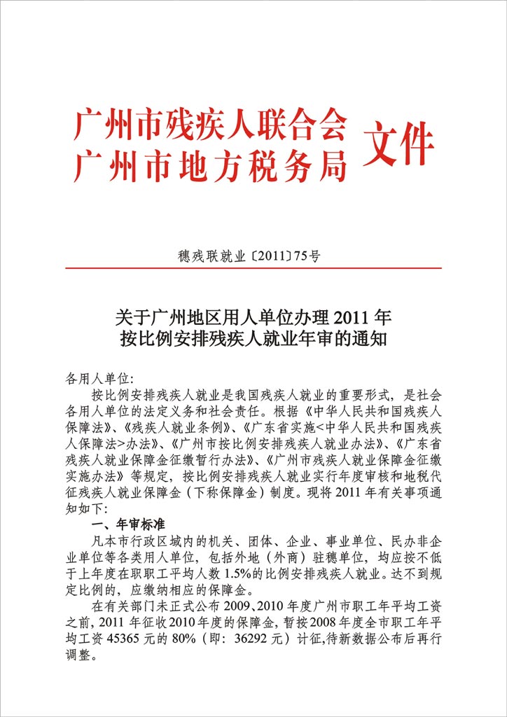 根據(jù)穗殘聯(lián)就業(yè)[2011]75號(hào)《關(guān)于廣州地區(qū)用人單位辦理2011年按比例安排殘疾人就業(yè)年審的通知》及附件《2011年廣州地區(qū)用人單位按比例安排殘疾人就業(yè)年審指南》的要求,凡廣州市行政區(qū)域內(nèi)的機(jī)關(guān)、團(tuán)體、企業(yè)、事業(yè)單位和民辦非企業(yè)等各類用人單位,包括外地(外商)駐穗單位,均應(yīng)按不低于上年度在職職工平均人數(shù)1.5%的比例安排殘疾人就業(yè)。達(dá)不到規(guī)定的比例的,應(yīng)繳納相應(yīng)的保障金。以勞務(wù)派遣形式用式的應(yīng)當(dāng)由勞務(wù)派遣單位履行按比例安排殘疾人就業(yè)或者繳納保障金的義務(wù)。勞務(wù)派遣單位應(yīng)在勞務(wù)派遣協(xié)議中與用工單位明確約定按比例安排殘疾人就業(yè)及保障繳納的事項(xiàng)。